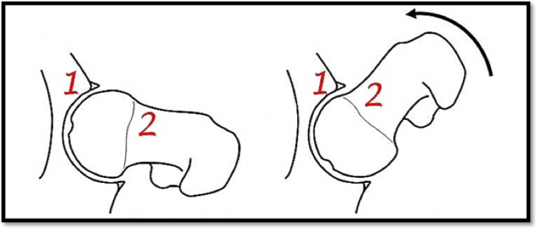 1. What is Femoro-acetabular impingement?In normal Hips when we squat or sit cross-legged the Cup of the hip joint allows the head and neck of the upper part of the thigh bone to move freely. This is shown in this diagram where the edge of the cup (1) does not hit the neck of thigh-bone (2) when the patient sits cross-legged.