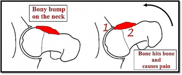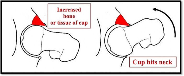 However in some patients either is extra bone growth in neck or there is extra bone or tissue growth in the cup which does not allow movements of the hip freely or causes pain. This is called Femoro-acetabular impingement.